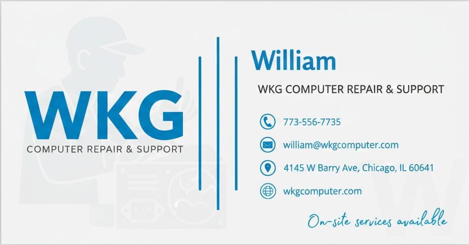¡Bienvenido a WKG Computer Repair and Support! ¿Su computadora está lenta? ¿Tiene problemas con virus, fallas de software difíciles o necesita ayuda para configurar una red nueva? Ofrecemos un servicio rápido, confiable y profesional para que su tecnología vuelva a funcionar sin problemas. Nuestro técnico experto (¡que es realmente excelente en lo que hace!) se encarga de todo, desde la eliminación de virus y la optimización del rendimiento hasta la recuperación de datos y la instalación completa del sistema.